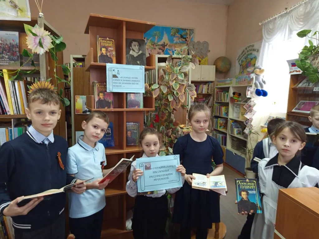 Директор библиотеки Алехина Н.Д. для своих читателей подготовила литературное путешествие по сказкам А.С.Пушкина. В начале мероприятия библиотекарь напомнила юным читателям о жизненном и творческом пути поэта, о роли его няни Арины Родионовны, которая рассказывала ему сказки, и о том, как эти истории позже стали основой для пушкинских сказок. Ребята познакомились с книжной выставкой «Его Величество - поэт», посмотрели презентацию «Что за прелесть эти сказки», приняли активное участие в разнообразных турах: ответили на вопросы Кота учёного, вспомнили сказки по отрывку, сложили из слов фразу из сказки, собрали из букв имена героев сказок, вспоминали все числа, которые встречались в сказках А.С. Пушкина. Ребята читали свои любимые стихи поэта, дополняли рассказ библиотекаря о жизни классика.
