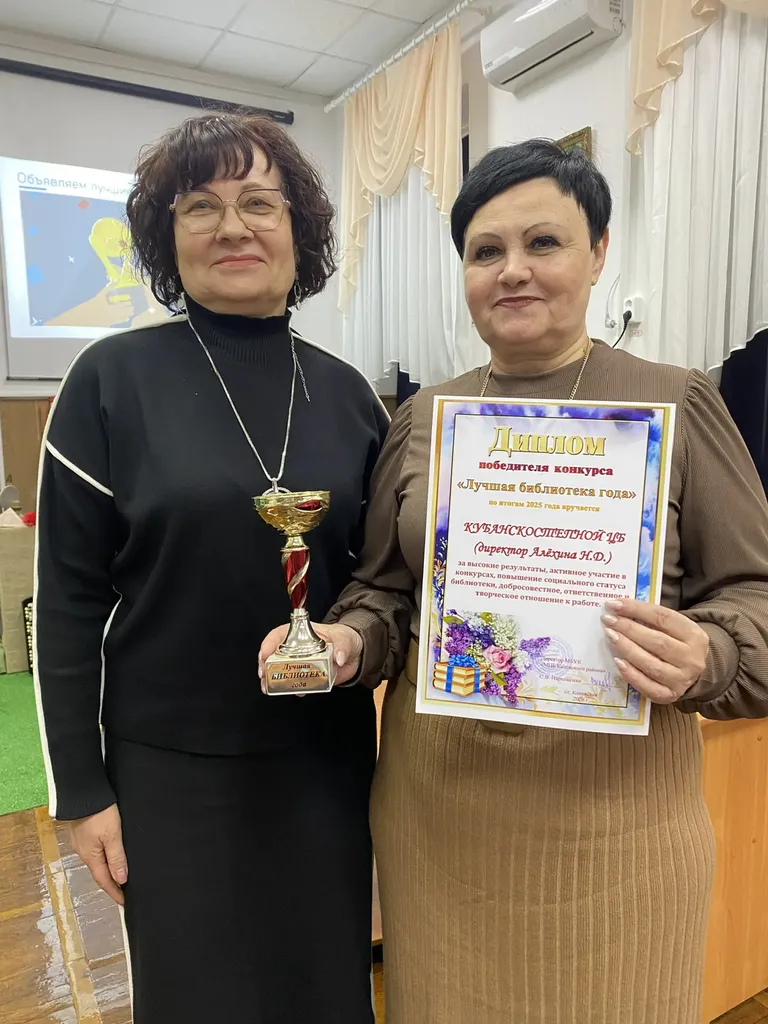 В Каневском районе объявили победителей муниципального конкурса «Лучшая библиотека года». На семинарском занятии в межпоселенческой центральной библиотеке состоялось награждение победителей с вручением переходящего кубка, грамот и подарков. В Год защитника Отечества библиотеки района активно проводили мероприятия, выполняли показатели по числу читателей, книговыдаче и посещению, участвовали во всероссийских, краевых и муниципальных конкурсах и акциях. Лучшей библиотекой 2025 года стала Кубанскостепная центральная библиотека, которой руководит Наталия Алехина. В течение года руководитель занимала призовые места в профессиональных муниципальных конкурсах, также привлекала к участию в соревнованиях своих читателей, организовывала досуг односельчан в библиотечных клубных объединениях, вела проектную деятельность, занималась сбором краеведческой информации, делилась опытом работы с коллегами. Лучшей маленькой библиотекой стала библиотека хутора Мигуты – филиал № 2 стародеревянковской библиотечной системы.