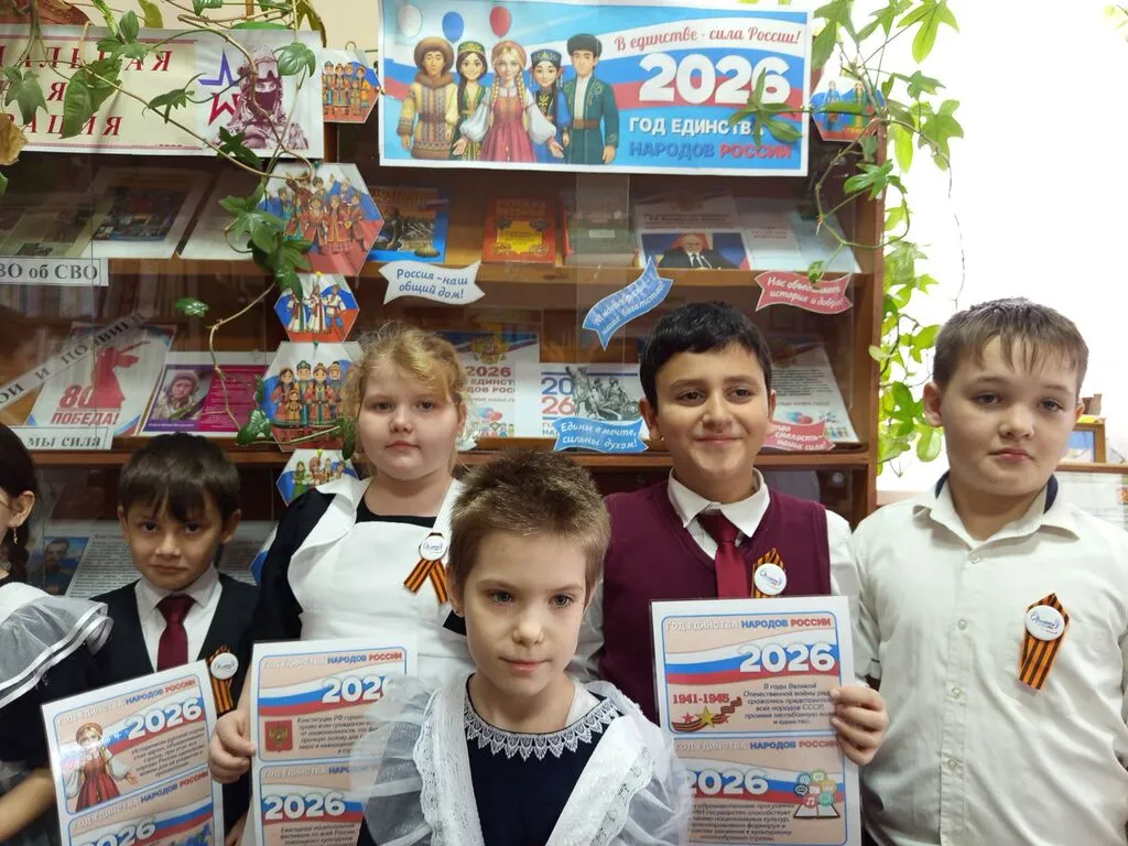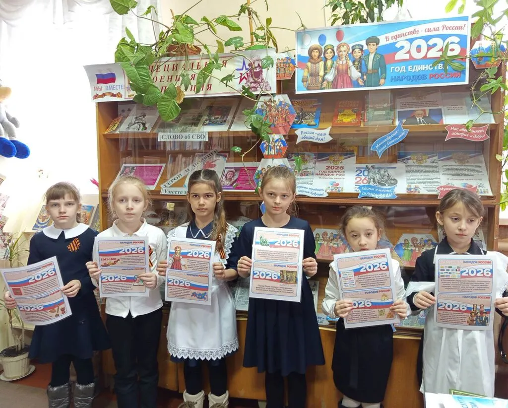 В рамках празднования Года единства народов России в нашей библиотеке состоялось тематическое мероприятие для учащихся. Цель встречи — познакомить школьников с культурным многообразием нашей страны, укрепить чувство патриотизма и взаимоуважения, показать, что сила России — в единстве её народов. Учащиеся посмотрели познавательную презентацию «Народов много — Родина одна», которая раскрыла темы: краткую историческую справку о формировании многонационального российского государства; обзор крупнейших этносов, проживающих на территории России (русские, татары, чеченцы, башкиры, буряты, якуты); особенности национальных традиций, праздников и обычаев разных народов; роль русского языка как средства межнационального общения; примеры исторических событий, когда единство народов помогало стране преодолеть трудности. Визуальный ряд презентации включал фотографии национальных костюмов, предметов быта, архитектурных памятников и пейзажей разных регионов России.